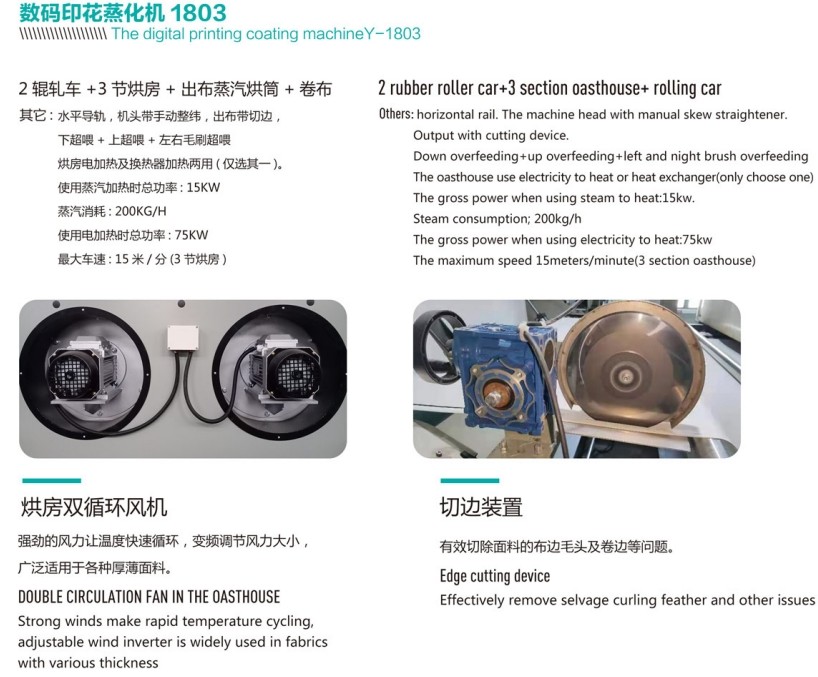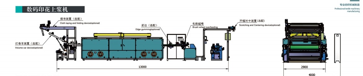 数码印花上浆机通过轧车将糊料及相关助剂均匀的轧在布面上,使布面平整方便打印,助剂有利于染料发色;